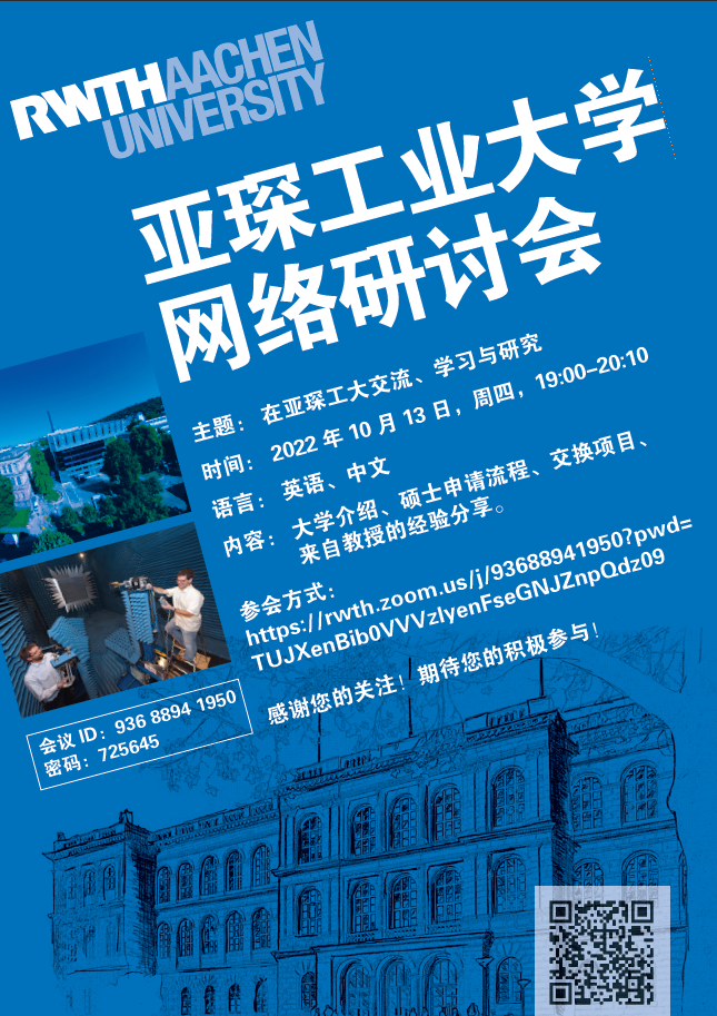 我校合作伙伴德国亚琛工业大学将于10月13日(星期四)在线举办主题为“在亚琛工业大学交流、学习与研究”的网络研讨会,届时将介绍亚琛工业大学及该校硕士学位项目、学生交换项目及申请相关信息,欢迎感兴趣的同学届时参会。