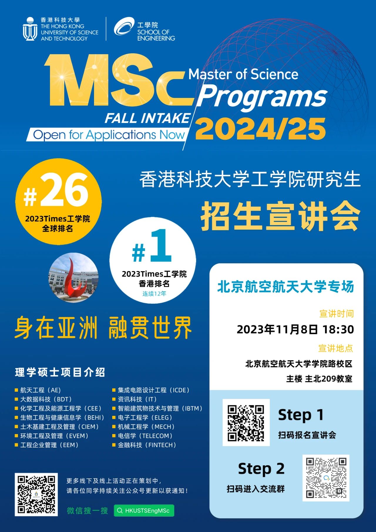 11月8日(星期三)下午,香港科技大学(the HongKong Unversity of Science and Technology)工学院将向我校学生介绍港科大理学硕士课程及2024/2025学年招生计划。王吉光教授将于此次宣讲会对理学硕士生物分子工程与健康信息学MSc BEHI ,以及理学硕士化学工程及能源工程学MSc CEE 进行讲解。北航往届校友、2022届港科大MSc BDT毕业生DUAN Muzhi也会参加本次宣讲会,分享其在科大工学院的学习与生活体验。有意赴港科大攻读硕士学位的同学,欢迎踊跃参加。