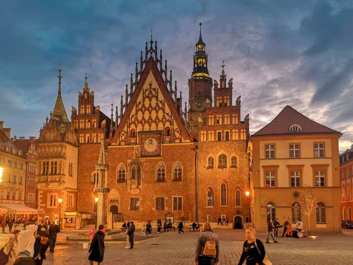 经过近十多个小时的联程航班与四个小时的大巴,我们大约在当地时间6月30日晚上8点左右到达弗罗茨瓦夫。弗罗茨瓦夫位于波兰西南部,是波兰第四大城市,也是下西里西亚省的首府。由于纬度较高,当地接近9点才完全天黑。大巴缓缓穿过市区,夕阳的余晖洒在街道旁彩色的房子上,洒在揉杂了哥特式与巴洛克风格的教堂尖顶上,洒在缓缓流淌的奥得河面上。尽管经过长途跋涉颇为劳累,但此时的景象还是将我唤醒,因为此时的弗罗茨瓦夫符合我所向往的欧洲老城的景象。